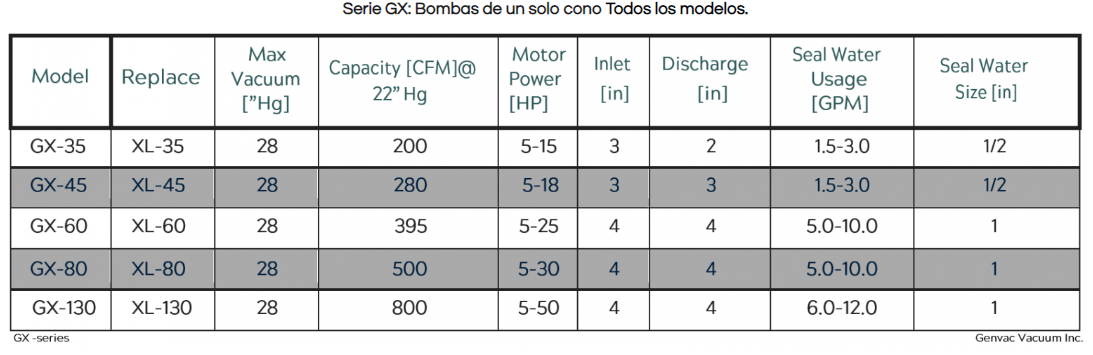Nuestras series GX son diseñado como reemplazo directo para las bombas de vacío de la serie XL. Esta bomba de vacío de anillo líquido de cono único de 200-800 CFM está diseñada para tener solo una parte móvil para inducir la máxima estabilidad mecánica con la máxima confiabilidad. Esta bomba de vacío de anillo líquido de cono simple de hierro fundido es adecuada para entregar vacío a su máxima capacidad en condiciones difíciles de agua repentina y babosas de partículas. Ofrecemos versión con capacidades que van desde 200-800 CFM.